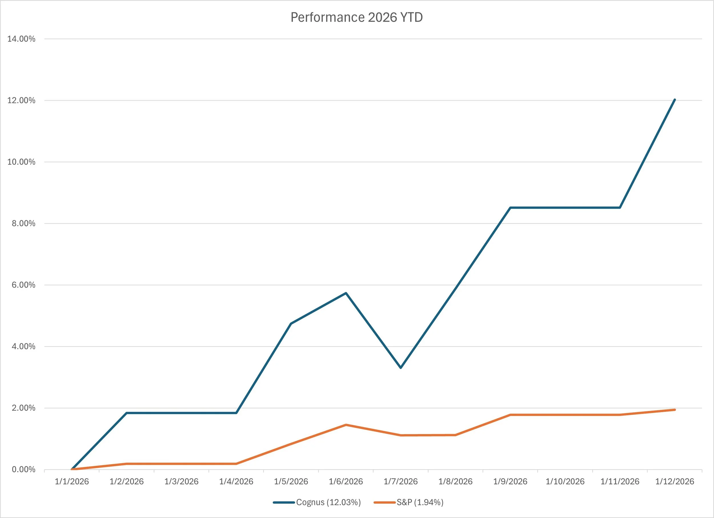 STOCK PRICE in 01/12/26: $171.78 PERFORMANCESince Inception: accumulated performance of 334.3% in 4 years vs 54.7% of the S&P Performance 2025 Cognus :+53.3% x S&P: 16.4% Performance 2026 YTD as of 1/12/2026 Cognus :+12.0% x S&P: 1.9%